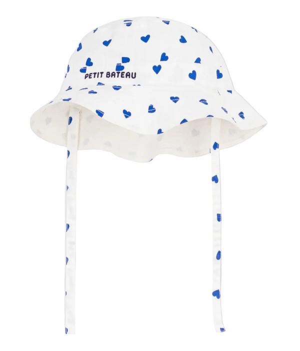Complete her sunny day outfit with the White and Blue Baby Hearts Bucket Hat by Petit Bateau.