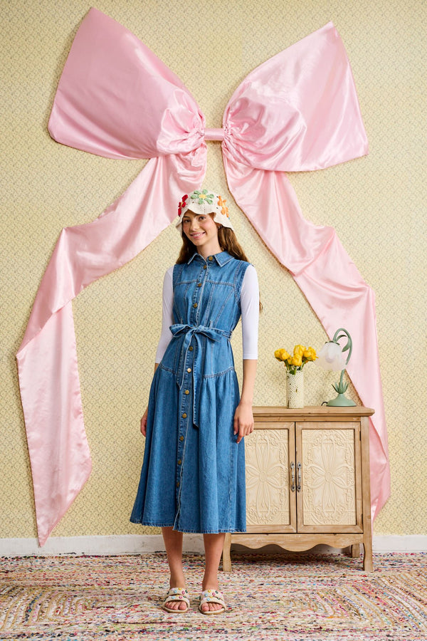 This classic denim piece features a full button-down front with gold-tone buttons and a crisp collar. The matching tie belt allows her to adjust the fit for maximum comfort, while the sleeveless design makes it perfect for layering over tees. It is a versatile favorite that is durable enough for everyday play yet stylish enough for family outings.