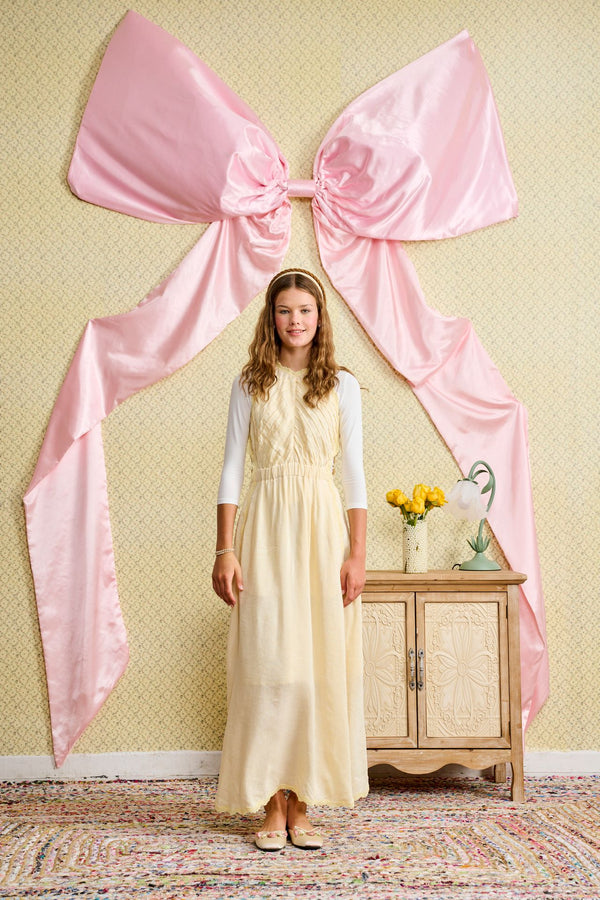 This sunny yellow jumper brings a warm glow to her everyday look with its soft, cheerful color. It features lovely pleated texture on the bodice and a sweet scalloped hemline. With its comfortable elastic waist and long flowy skirt, it is perfect for layering over a simple top for a cozy, stylish outfit she will love wearing.