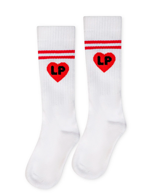 Crafted from a soft comfortable white knit fabric, these adorable knee-high socks feature a classic athletic-inspired design. The playful look is beautifully detailed with two sporty coral stripes along the upper cuff and a vibrant coral heart motif showcasing bold black "LP" initials on the calf. Designed with a snug, stretchy ribbed upper to ensure they stay comfortably in place all day long, perfect for pairing with her favorite skirts, shorts, or dresses for school days and active play.