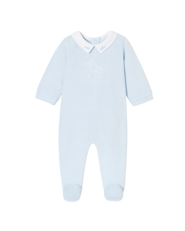 This light blue one-piece features a sweet white Peter Pan collar with delicate embroidery on the tips for a refined touch. A charming white bunny illustration adorns the chest, adding a gentle, classic feel. Finished with snap buttons down the back, it ensures easy dressing while keeping his little toes warm.