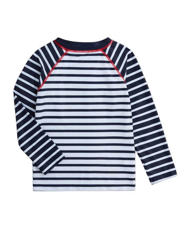 Featuring a timeless design with crisp navy blue and white horizontal stripes throughout, long raglan sleeves that offer extra sun protection, and visible red contrast stitching at the neckline and seams for a sporty pop of color. This luxury kids' rash guard ensures he stays safe in the sun while looking his best.