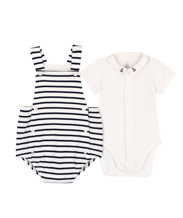 Introducing the White and Navy Baby Stripe Overall Set by Petit Bateau.