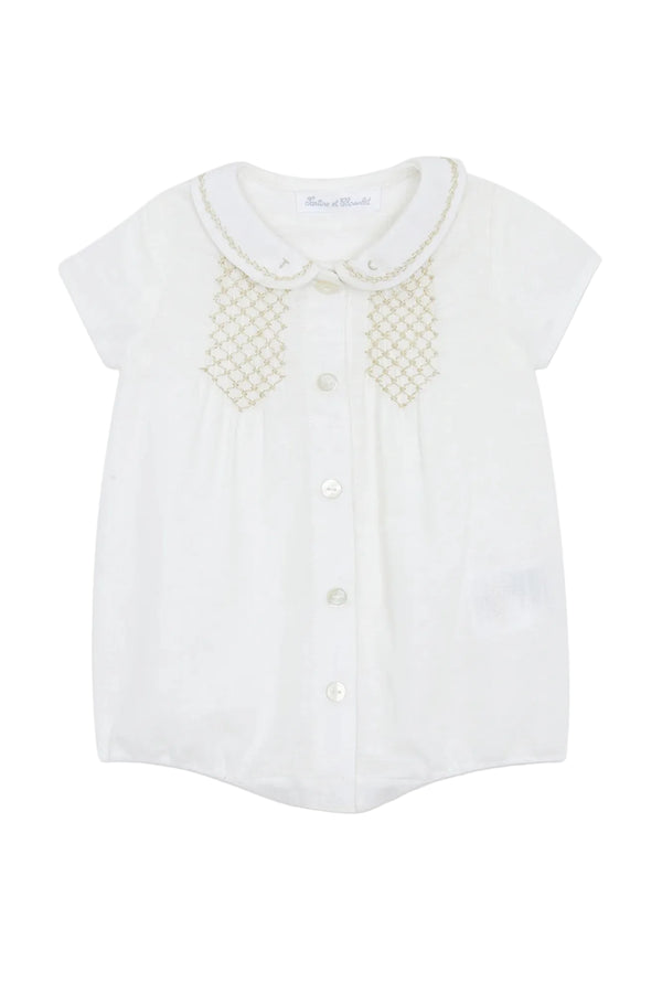 This romper is crafted from crisp, breathable white linen, perfect for warm days. The design features a classic Peter Pan collar adorned with delicate beige stitching and the brand's initials on the points. Two panels of intricate beige smocking detail the chest, adding a touch of traditional elegance. A central button placket allows for easy dressing, while the short sleeves and elasticated leg openings create a comfortable bubble silhouette.