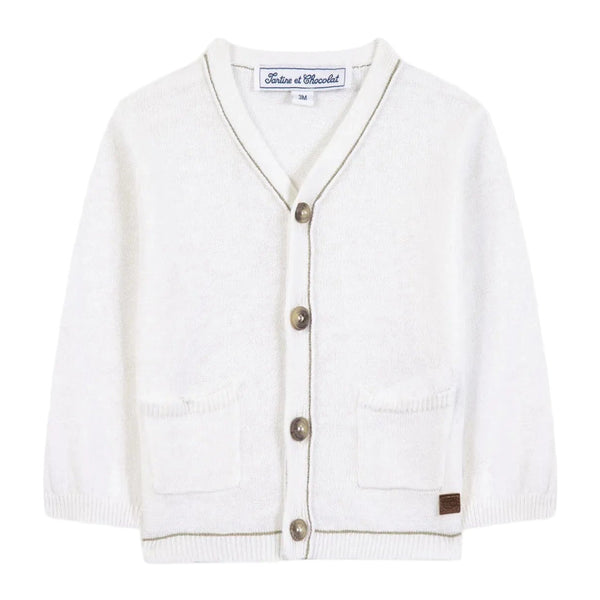 This cardigan is crafted from a soft white knit, perfect for adding a layer of warmth. The design features a V-neckline framed by subtle green piping that runs down the central button placket and along the hem. It fastens with contrasting buttons for a sophisticated look. Two patch pockets adorn the front, with the right pocket finished with a small brown logo tag. Ribbed cuffs and hem ensure a snug and comfortable fit, making this luxury infant knitwear a versatile addition to his wardrobe.