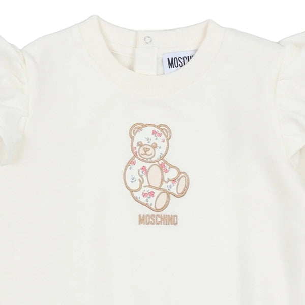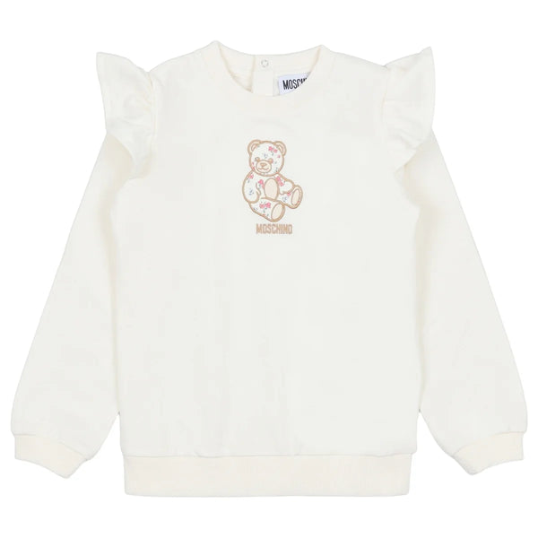 The Cloud Ruffle Sleeve Bear Crewneck by Moschino is a sweet and playful piece made for your baby girl.
